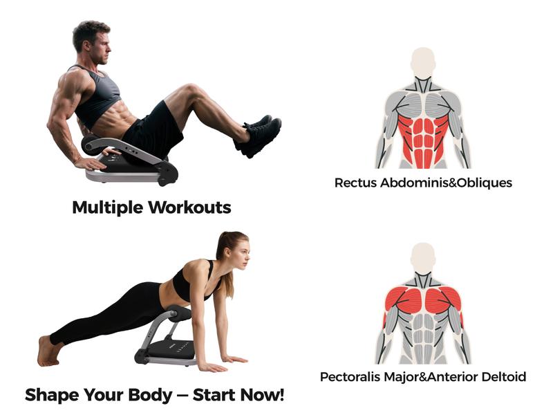 - [ 8-in-1 Full-Body Workout]: Maximize your fitness with a versatile ab machine that delivers a comprehensive workout. Perform sit-ups, push-ups, glute bridges, scissor kicks, forearm curls, triceps dips, ab tucks, and bicycle crunches—all in one session. Airhop ab workout equipment targets multiple muscle groups, strengthening your core and toning your arms, shoulders, thighs, and legs. Perfect for a complete, efficient workout at home.
